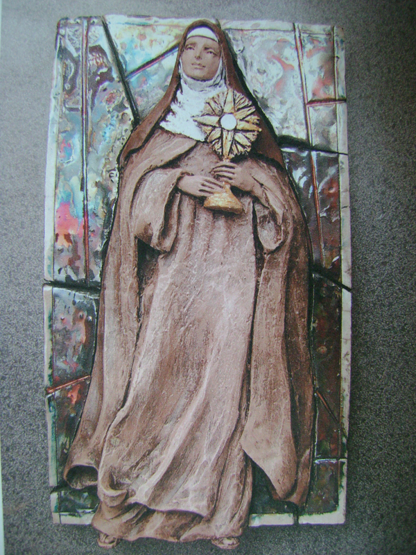 St. Clare; wall relief; fired clay with raku glaze; 16" x 6"; private collection
