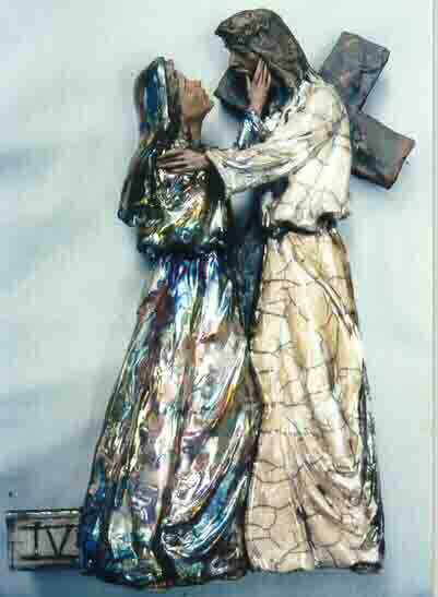 4th Station - Fired Clay and Raku Glaze, 2 feet in height at St. Joan of Arc Church, Merrillville, IN
