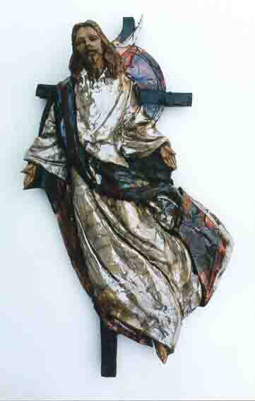 Risen Christ; 24" in height x 14" in width; Sacred Heart Catholic Church, Grosse Ile, MI; fired clay with raku glaze