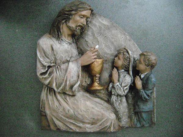 Title: First Holy Communion; fired clay with color applied; 18" x 18"; Our Lady of Victory grade school, Northville, MI