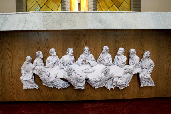 Last Supper (attached to the altar); 5 feet across x 18" in height; fired clay with patina coloring applied
