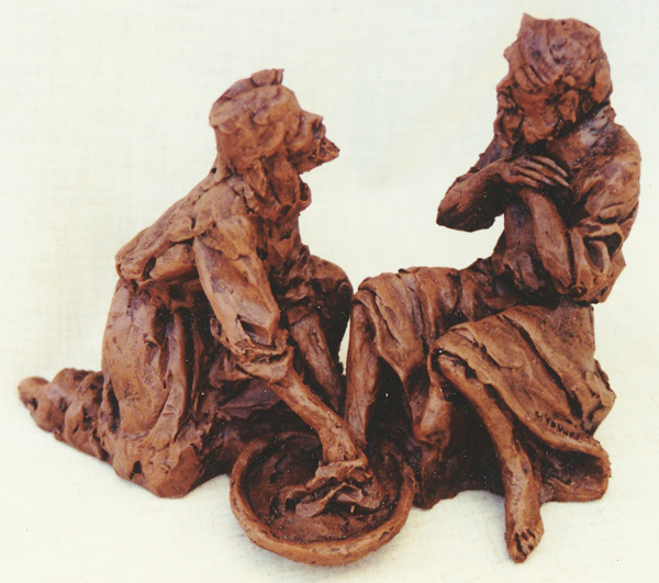 three dimensional fired clay, 12" in height, with patina coloring applied.