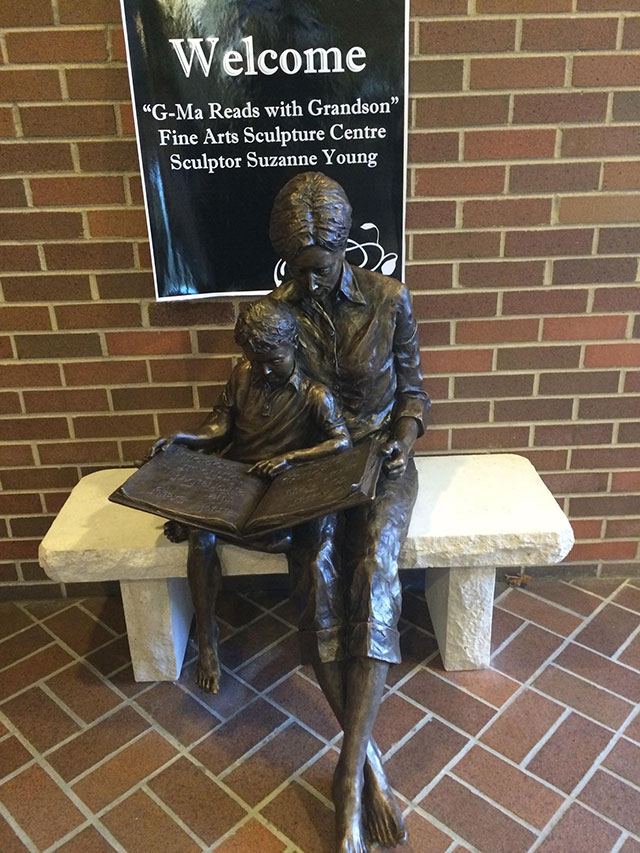 Life size bronze sculpture of a "Grandmother reading with Grandchild". 2015. Orion Township Library, Orion, Michigan
