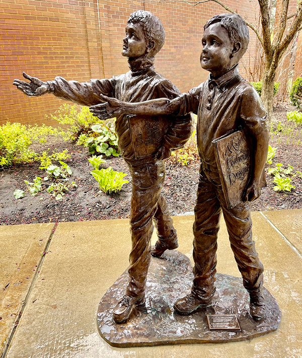 Bronze cast 4 foot sculpture. “Boys leading all to higher learning”. Orion Township Library, Orion, Michigan 2020