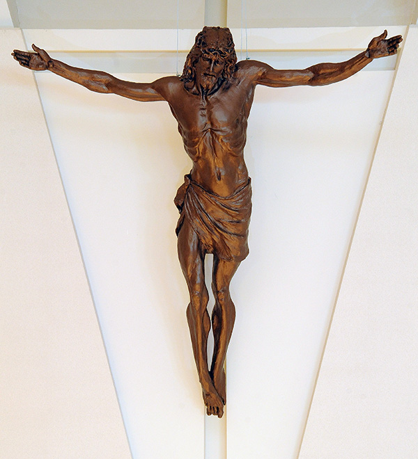Crucified Christ cast resin and fiberglass 6 foot in height sculpture suspended from ceiling at St. Thomas More Catholic Church in Troy, Michigan.
