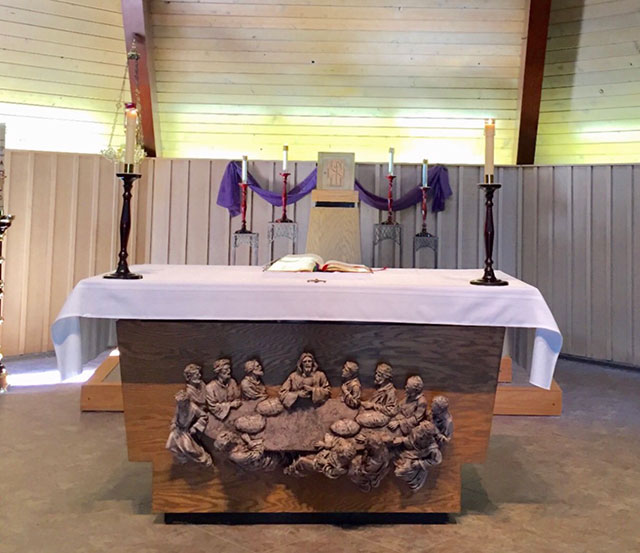 Last Supper high relief sculpture; fired clay with patina coloring; 4 feet in width. Attached to the altar in St. Anthony Catholic Church; Selby, South Dakota.