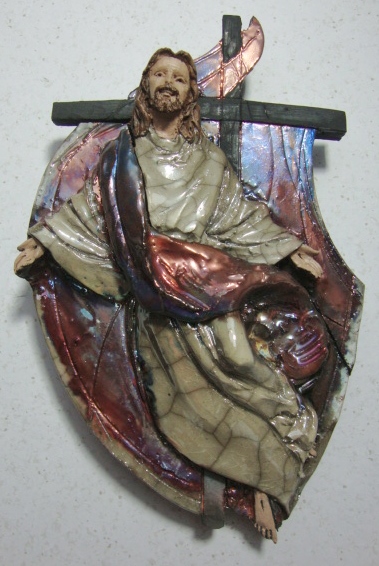 Materials: fired clay; raku glaze; mixed media
